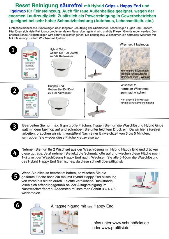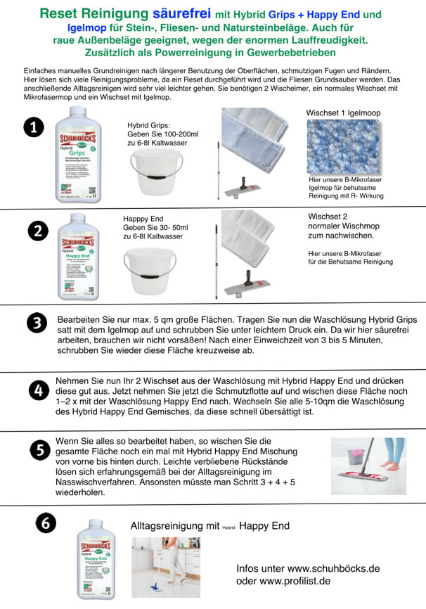 Reset Reinigung säurefrei. Für Fliesen und Naturstein bei dunklen Fugen, fetthaltigeren Verschmutzungen. Für Privatanwender gut geeignet. Igelmop!