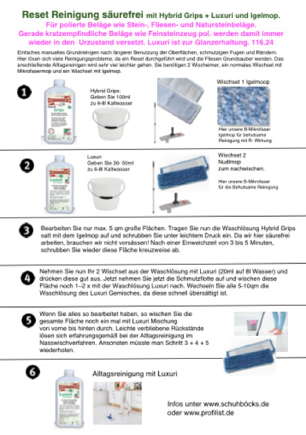 Reset Reinigung säurefrei. Für Fliesen und Naturstein bei dunklen Fugen, fetthaltigeren Verschmutzungen. Für Privatanwender gut geeignet. Igelmop!